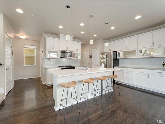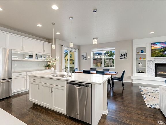 Exquisite turn-key home in Shoenberg Farms! This modern residence on a desirable lot is the epitome of contemporary luxury & comfort. As you step inside, you'll be greeted by an abundance of natural light streaming through large windows, highlighting the gleaming hardwood flooring that graces the main level. The open living room, complete with a cozy fireplace & built-in shelving, provides a warm & inviting ambiance. The heart of this home is undoubtedly the stunning kitchen featuring quartz countertops, a spacious island, & stainless steel appliances. Adjacent to the kitchen is a large formal dining space. Venturing upstairs, you'll find a wonderful loft, offering a versatile space that can be transformed into a home office or a cozy reading nook. The spacious primary suite is a true retreat, boasting a luxurious step-in shower, dual sinks, & a generous walk-in closet. Two additional bedrooms & a well-appointed bathroom provide ample space. For those who work from home, this property is wired for data, ensuring seamless connectivity & productivity. The finished basement is a haven for entertainment, featuring a bedroom & bathroom that acts as a guest suite, along with a theatre area perfect for hosting movie nights. Step outside to discover the low-maintenance backyard with stone tiles & artificial grass, creating a wonderful space for outdoor activities & relaxation. You'll find yourself within walking distance to scenic trails & Faversham park with a serene lake. Enjoy the convenience of nearby Starbucks & various food options. The property's proximity to the light rail, Olde Town Arvada, & quick access to I-70, I-76 & Hwy 36 make commuting a breeze. Exciting developments are also on the horizon with the upcoming Food Hall at Shoenberg historic farm building. Recent updates include a custom-made barn door with an inlaid mirror in the primary suite & upgraded fixtures. Truly a show-stopper!