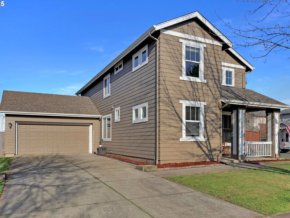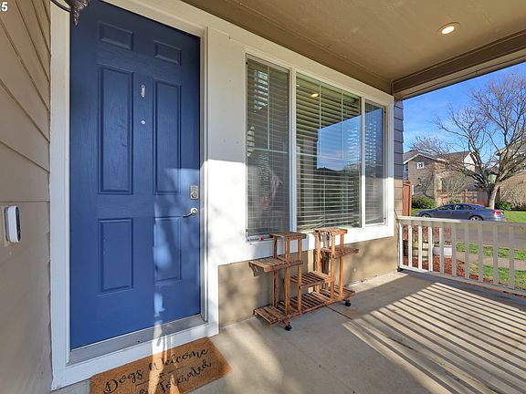 There's room for everyone in this 5 bedroom 3 bath home, situated on a corner lot. Vaulted ceilings let in lots of natural light. The living room has an inviting gas fireplace, is wired for surround sound, and opens to a kitchen with large island, stainless appliances including the fridge that stays, Deep pantry, and newer tile backsplash. This home is great for entertaining, with the large fenced yard with great patio area, and a formal dining area inside, plus a main floor bedroom and full bath would make a great guest area. Upstairs you'll find 4 spacious bedrooms, including the large primary suite with great walk in closet. The laundry room has lots of storage and utility sink. The heat pump/AC is new (2022). And you can charge your Tesla in the garage! 2 blocks away you'll find the park, K-8 school, and Babe Ruth Baseball fields. This home has it all!