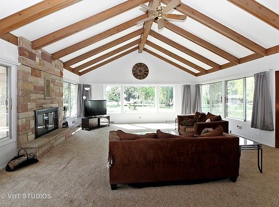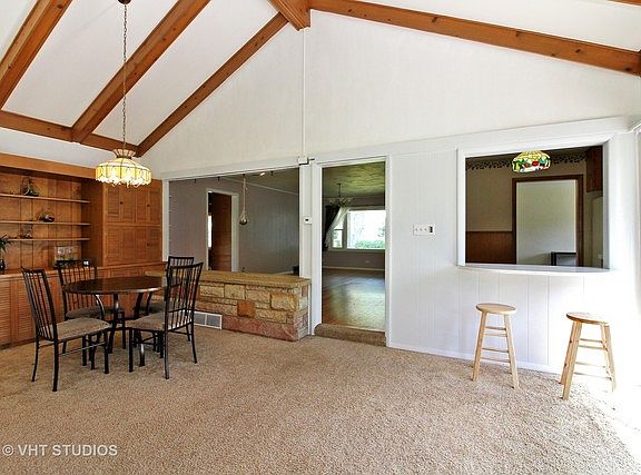 Solid ranch home with open floor plan perfect for entertaining! Dining room area has beautiful refinished hardwood floors and stone wood burning fireplace. Knotty pine cathedral beams adorn the ceiling in the great room w/a second wood burning fireplace, half bath, & three walls of windows allowing for tons of natural light and sliders leading to spacious patio and large backyard. See-through kitchen w/ breakfast bar. Original wrought iron finishings, original tile floors from the era in which this home was built! Full unfinished basement w/plenty of storage waiting for your finishing touches. Large 2 car attached garage, and driveway for plenty of parking. Very spacious laundry/mud room that an be easily converted to third bedroom. Must see!
