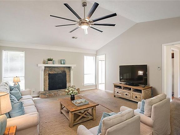 Decorative fireplaceRocking chair front porchOpen and airy feelVaulted ceilingsBonus roomFresh interior paintWood laminate floors