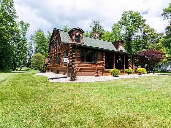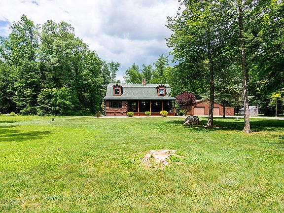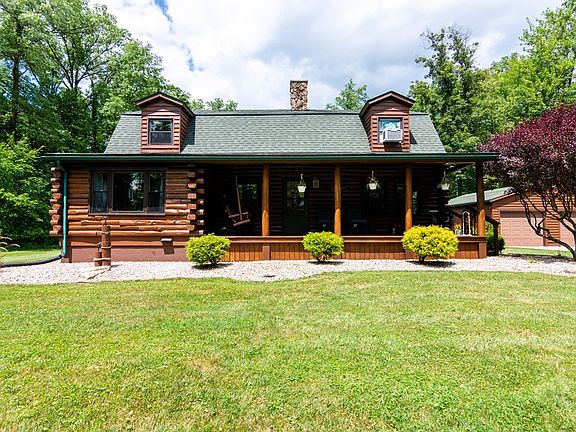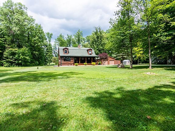Beautiful setting on this wooded lot sit a Log Cabin. Move in condition. Large Great room with wood burning Fireplace and new carpet 3 months ago. Nice size dinning area with wood like floors that is open to kitchen. Extra room on first floor that could be a office or bedroom or tv room. Upstairs has a nice size master bedroom and two other bedrooms. All have new carpet. Newer Amish windows through out house. Wonder front porch and rear back deck that over looks this wonderful yard. Large two car garage with workshop and extra storage shed. Rec Room in the lower level with pool table and bar. House is wired to plug in a Generator when lose of power.