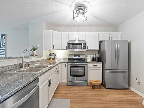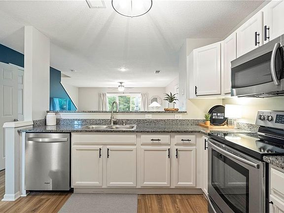 UPDATED FROM HEAD TO TOE AND UNDER $200,000!! You won't find a more darling townhouse out there! ALL flooring has been updated to modern LVP (main level and bathrooms) and neutral carpet (stairs and upper level). New light fixtures throughout. Newly painted kitchen and vanity cabinets. Granite kitchen countertops. Stainless steel appliances. Upstairs laundry. Two huge bedrooms with extended closets in each. Attached garage. Back patio with privacy landscaping. PLUS you'll have access to the community pool and will be in close proximity to highway, gas station, grocery shopping!
