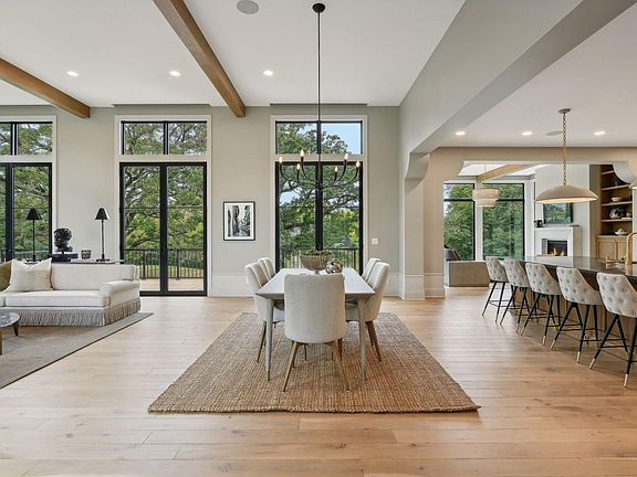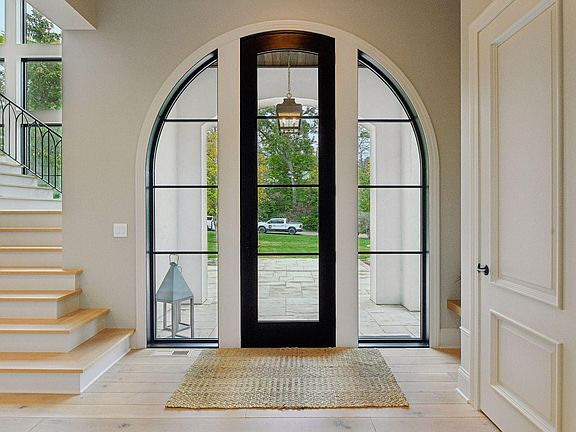 Inside, soaring ceilings and wide arches create an open, airy atmosphere and effortless flow. Applied moldings, color drenching, and curated lighting choices contribute to the home’s refined aesthetic.
