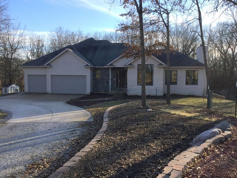 NEW PRICE! Beautiful setting for a beautiful 5 bedroom, 2.5 bathroom home. Situated on rolling and wooded acreage in a country neighborhood in the Argenta-Oreana school district, sits this stone and wood sided ranch with walk-out lower level. This home has an open floor plan perfect for entertaining and a growing family. The grand entry with custom inset ceramic tile floor leads to the formal living room with gas fireplace, office with built-in bookcases and desk, columned dining room with butler's pantry, and gourmet kitchen and dining area. The main floor master suite is spacious with gas fireplace, window seat, and access to the elevated deck that overlooks hardwood timber. The master bathroom has jetted tub, garden shower, dual vanities and large walk-in master closet. All bedrooms boast ceiling fans as well as the lower level family room. Down the wide staircase to the walk-out lower level you will find much living space with large family room, four additional bedrooms with walk-in closets and a Jack-n-Jill bathroom. Step out to the patio and enjoy your above ground swimming pool with deck this summer. Updates since August of 2016 include complete interior professional painting on the main level, light fixtures in the dining room, entry, master bath, and kitchen plus a remote controlled ceiling fan in the living room. The faucets and toilet in the master bathroom were recently replaced. Clearing and removal of dead trees and about forty stumps were ground as well. Main floor laundry room is 7.8x5.3 and has ceramic tile floor. Approximate Lot Dimensions: 377.57x739.57x211.65x915.44 Directions: Rt 48 N to East on Cundiff Rd. Follow around to Kirby. Turn south onto River Bluff Ct.