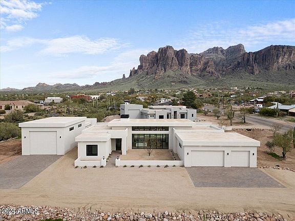 Indulge in the pinnacle of desert living with this stunning contemporary masterpiece, elegantly nestled at the base of the Flat Iron side of the majestic Superstition Mountains. Offering an unparalleled fusion of modern luxury and natural splendor, this iconic residence boasts panoramic views of the Superstition Mountains and the sparkling city lights of the entire valley. 4081 total sqft under roof every detail has been meticulously crafted to perfection. The main living space, adorned with 15-foot ceilings and a spectacular 24ft slider, serves as a captivating vantage point to behold the awe-inspiring vistas that define the essence of desert living. No expense has been spared in the design and functionality of this exceptional home. A gourmet kitchen awaits, adorned with top-trending earthy materials and equipped with Italian appliances, providing the ideal setting for culinary exploration and entertainment.