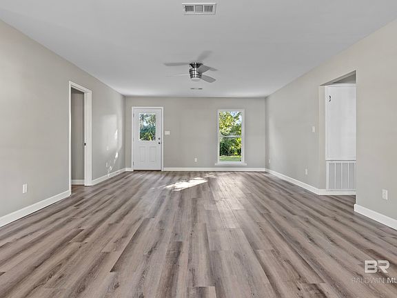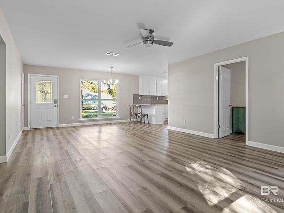 LOCATION in desirable Bear Point Estates, this remodeled Ranch Style home is waiting for you. Split floor plan, 3 bedrooms, 2 baths, large living room and open concept living/dining/kitchen. Freshly painted with vinyl plank flooring throughout, new kitchen cabinets, granite counter tops, tiled back splash and new stainless steel appliances. New cabinets, vanities, and commodes, in the bathrooms and the Primary bath has tiled shower. New interior doors, new insulation and gutters. Large back patio and covered entry in the front. The whole yard has just had sod and landscaped. Partially fenced and lots of privacy on this 100 x 100 lot. Storage shed. X Flood zone and no damage from Sally. Come and enjoy all the amenities of the optional Bear Point Assoc. $300 per year membership gives access to the boat launch, private beach and park, pier and community building. Bear Point Estates is a golf cart friendly community and has the popular OSO bar/restaurant which hosts live entertainment. The bay is just a short walk away. NO HOA!! NO FLOOD ZONE. Seller is a licensed Realtor in Al & FL. Buyer to verify all information during due diligence.