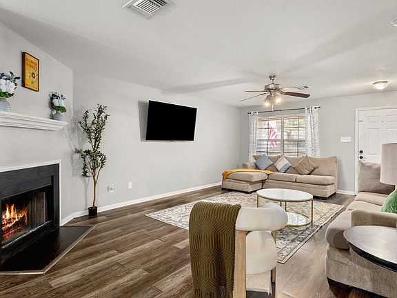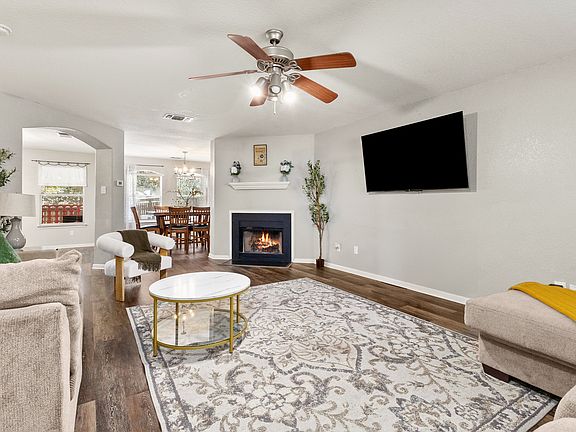This contemporary two-story home offers a harmonious blend of modern design and everyday convenience. Featuring three spacious bedrooms, two and a half bathrooms, and an expansive game room, the residence provides ample space for relaxation and daily living. The bright and inviting living area, enhanced by a cozy wood-burning fireplace, while the kitchen offers ample cabinetry and a convenient breakfast bar. The primary suite serves as a tranquil retreat with dual vanities and a luxurious soaking tub. Outside, the private backyard stands out with its spacious patio and well-maintained lawn, perfect for enjoying the outdoors. With its stylish design and thoughtful layout, this home is perfectly suited for comfortable living.