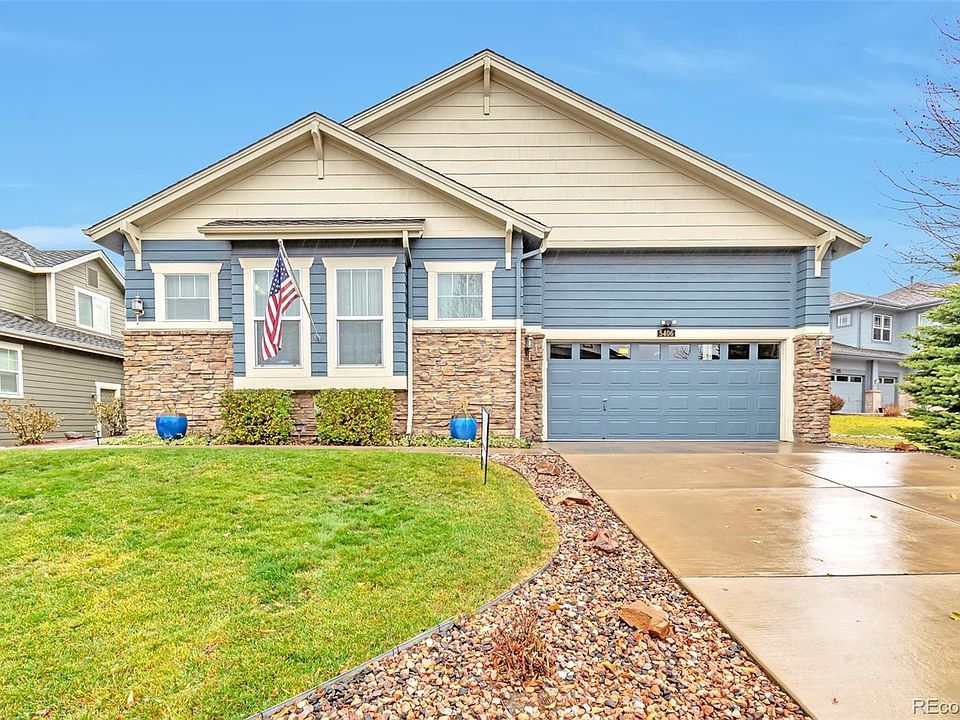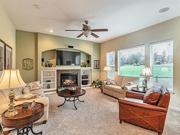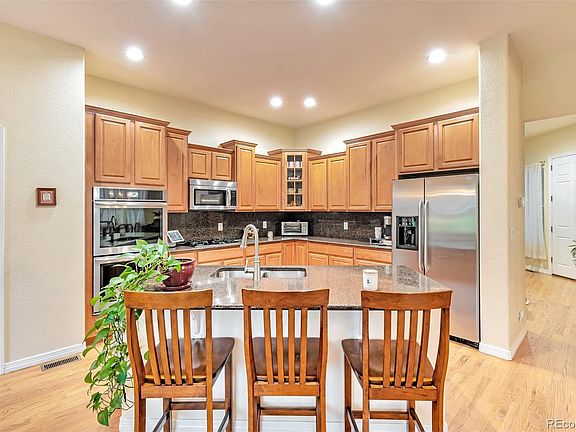 Back on the market after the holidays! Welcome to this beautiful ranch home in prestigious Vintage Reserve . Located on a quiet cul-de-sac and backing to a community greenbelt/trail. This home has everything you would expect in a luxury home: main floor living, 10’ ceilings, large primary suite with a 5 piece bath ( double sinks), walk-in closet, granite countertops, stainless steel appliances, pantry, double ovens, hardwood floors, lovely 42” maple cabinets, open concept kitchen/family room area (surround sound speakers), 3 car garage, laundry room including cabinets, sink, and counter space, and a beautiful finished basement with a kitchenette and fireplace. This home has 3 bedrooms and an office on the main level with 2 full bathrooms and a formal dining room. The basement is stunning with a large living area, an additional bedroom, ¾ bathroom, and plenty of storage. The outdoor deck is made with composite material and has a retractable awning. This home is solid with a brand-new Class 4 roof, 2-year-old furnace, 5-year-old A/C, new water heater, and is wired for security. This home is gorgeous with lots of natural light and tasteful colors. Great location with easy access to shopping, restaurants, grocery stores, and C-470.