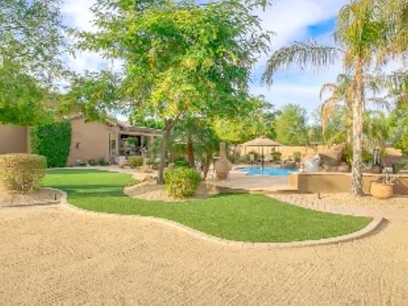 This home is incredible! Situated on almost 3/4 an acre, resort style backyard offers lush greenery and beautiful landscaping. There is a large, heated pool with water feature, and spa. A putting green, horse shoe pits, large grass area, and room to park toys, or build RV garage or casita. Both allowed by HOA. The patio is an entertainers dream with a built in BBQ, seating area, fire pit, more! Walk inside to an open, split floor plan with kitchen offering double ovens, large island, and huge walk-in pantry. Master suite has a large walk-in closet, and amazing bathroom with his/her sinks, soaking tub, walk-in shower, and separate exit to back patio. Guest bedrooms are roomy with jack and jill bathroom offering double sinks and shower/tub combo.