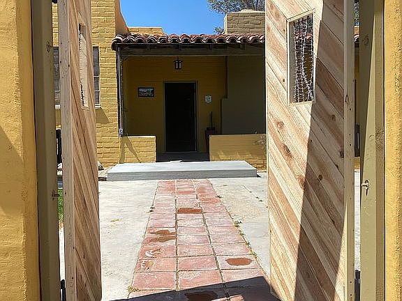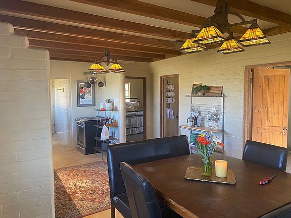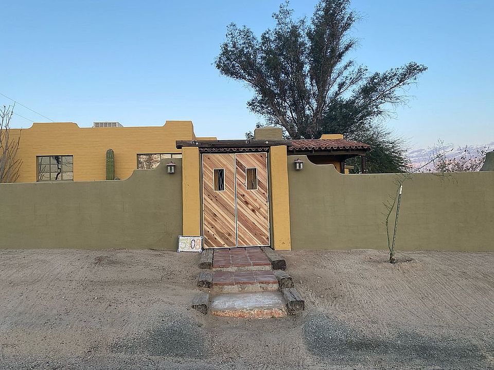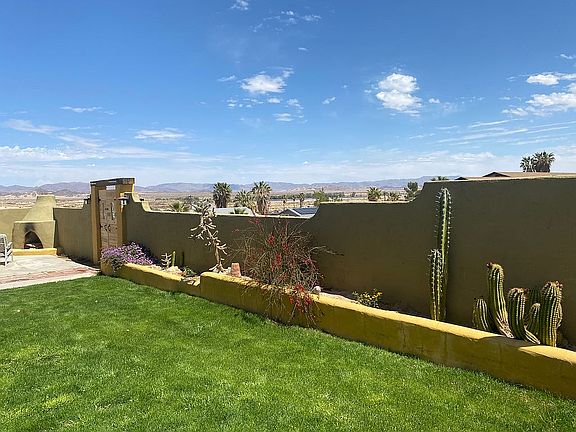 Beautiful and Move-in Ready. Unique, Adobe style, single family home on a large corner lot in the Ben Hunter Tract. A family neighborhood close to Schools, Luckie Park, Marine Corp Base, within walking distance to the Historic Plaza, 3 miles to the Joshua Tree National Park Visitor Center, and 4 miles to the Park Entrance. This 3 bedroom, 2 bath home has plenty of outdoor living spaces. 3 Patios one with an outdoor fireplace. 2 master suites with walk in closets one has a wood burning fireplace. Large living room with open beam ceiling, fireplace and a great view of beautiful 29 Palms. 3rd bedroom can be used as an office, comes with a Murphy bed. Open concept kitchen with wood beam ceiling and concrete counter tops. 2 Master Kool evaporative coolers, natural gas and mini split in one of the master bedrooms, 2 car, detached garage. Plenty of yard for gardening, horseshoes, and other outdoor entertainment. Stainless steel appliances included. This is a must see, one of a kind home with lots of custom features.