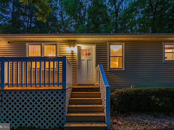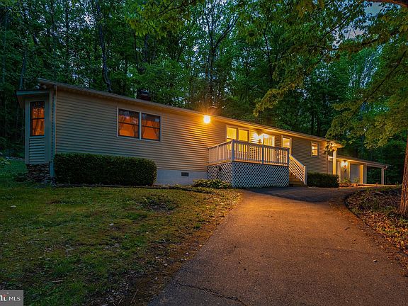 This welcoming ranch style home tucked into a 2.25 acre wooded lot has a spacious main level with updated kitchen with updated appliances, freshly painted cabinets, an updated countertop and vinyl plank flooring that expands into a breakfast area/sitting room with picture window (this room used to be the 3rd bedroom). Separate dining room with adoarble built in cupboard with glass door and hardwood floors, living room offers hardwood floors, brick fireplace and bay window. Two bedrooms (primary bedroom offers a walk-in closet) with space in between for potential half bath. Updated full bath in hall with gorgeous vanity, walk-in shower, vinyl plank flooring and wainscotting. Unfinished basement with water proofing system already in place. Screened-in porch with free standing fireplace with stone surround between house and 2 car garage. 2 car carport with tons of possibilities, it would make a wonderful pavillion. Beautiful lot with circular driveway and just minutes to Rt 340. New A/C in 2022, some replacement windows (accept in primary bedroom and living room). Front porch floor just replaced along with front door. B-dry water proofing sytem installed in basement in 1987. This is a must see.