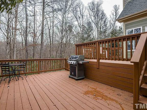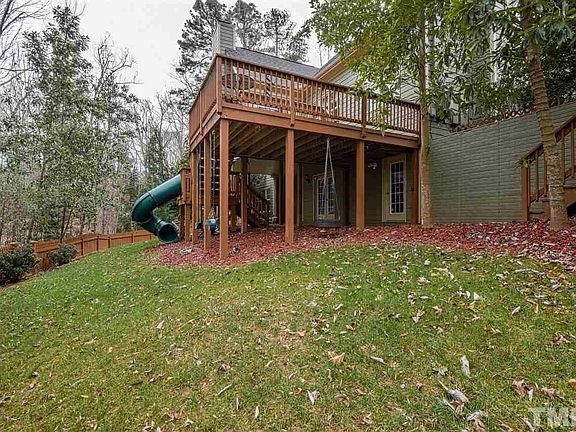 Fully Permitted In-Law Suite on the basement level AND Master on the Main level!!! Ever wanted to live on a private wooded 1.5+ acre lot in North Raleigh? Here is your chance! This beautiful home has tree house views. The main floor Kitchen (one of two kitchens) has stainless steel appliances, granite countertops with an open concept living room and dining area, beautiful sunroom AND bonus area near the upstairs bedrooms could easily be a play room or office! Also, don't forget the deck with a slide!