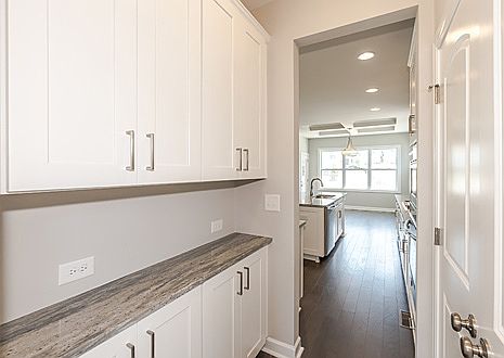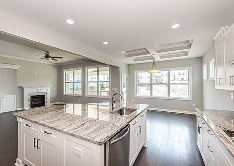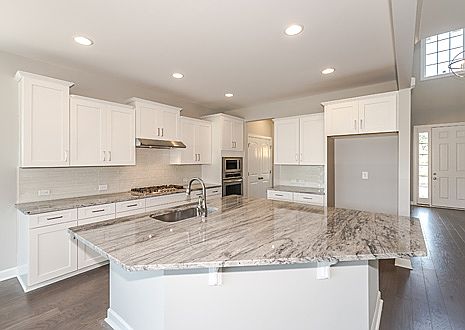 This master-down home offers a Craftsman style exterior with painted siding. Inside off the Foyer is a formal Dining Room with a walk-through Pantry leading to the Kitchen. The Kitchen boasts a large grand-piano style island with granite counters, Linen (white) painted cabinets, stainless steel split cooking appliances with 36" gas cooktop and tile backsplash. Next to it is the Breakfast room which has abundant windows and features a nice coffered ceiling. A door there leads to the Rear Covered Porch. The Family room offers a gas fireplace and media niche. The Owner's Suite on the main floor is spacious; the bathroom includes a vanity with 2 sinks and quartz Carrara-like countertops, white painted cabinets, soaking tub, large tiled shower and walk-in closet. The first floor is rounded out with a Laundry room and Mud Room off the garage. Upstairs, a step up takes you to the large Rec Room with tray ceiling. There are also 2 bedrooms which share a Jack/Jill bath, plus a third bedroom and additional bathroom. 5" hardwood floors flow throughout most of the first floor, with tile in all full baths and Laundry room. The 2 car garage is extended to provide additional work or storage space.