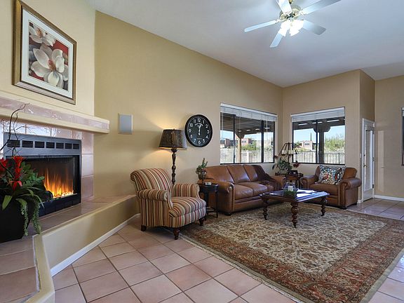 Location, location, location! Nestled at the end of a cul-de-sac, buffered by a large, lush arroyo, sits this wonderful home. Minutes from schools, shopping & major arteries. Dramatic soaring ceilings, arched entries & walls of windows keep the spaces open & light and bring in spectacular Catalina Mtn & sunset views. The kitchen offers gas cooking, pantry, work center, breakfast bar & eating nook. The family room enjoys a gas fireplace & those incredible views Spacious master suite offers Mtn & sunset views, access to the covered patio & pool, a large walk-in organized closet + a bathroom featuring dual sinks, soaking tub & separate shower. Multiple glass doors provide access to a huge, wrap around covered patio & a separately fenced pool & spa.