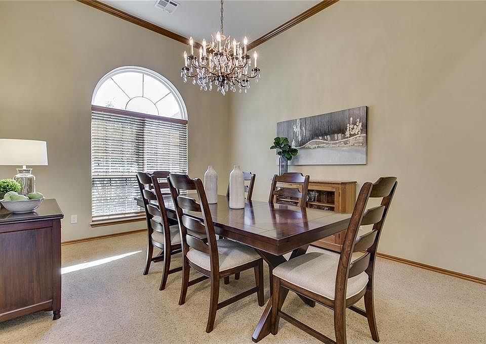 Airy and bright, the welcoming foyer greets you with sophisticated style. To the left, the grand formal dining room is adorned with a timeless chandelier. On the right, French doors lead to the multi-purpose study with custom built-ins. Alluring architectural details include flawless woodwork and tray ceilings in living and master. At the heart of the home you'll find the vibrant kitchen providing an abundance of storage. Retreat to the en-suite master wing. This spacious sanctuary lends a private entrance to your back patio, double vanities and jetted tub with four-seasons closet. Not to be missed, generously sized secondary bedrooms and an oversized utility room. Exterior features include 3-car garage with pass through to the backyard, sizeable storm shelter, custom landscaping and substantial covered back patio. You will not be disappointed by this thoughtfully cared for home. Located near many amenities, Glenhurst offers a pond and many sidewalks for a pleasant, neighborly feel.