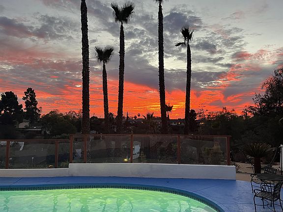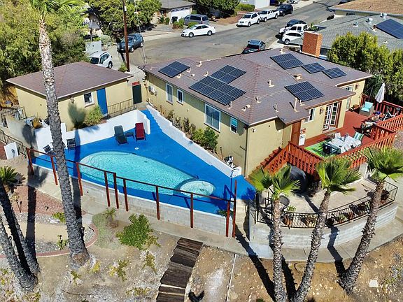 Rare on the market! Exceptional TALMADGE Neighborhood! Single level home in prime cull de sac View location! Minutes to all that San Diego has to offer. Resort Style ! over 1/3 acre with panoramic views above the canyon. Brand new roof with solar. Beautiful renovated pool and spa, lawn and decks all in a peaceful and serene setting. Totally updated with Designer finishes throughout: Cut crystal doorknobs, hardwood floors, dual pane windows, French doors, plantation shutters, marble fireplace and designer colors. Extra large decks connect seamlessly create spacious indoor and outdoor living rooms and dining areas with views. The huge terraced yard offers pomegranate, Meyer lemon, grapefruit, fig, tangerine, plum and kumquat fruit trees and even has a large, fenced space that could be used for a dog run or garden. Potential Granny Flat, ADU on this 1/3 View Lot! Solar panels reduce your utility bills while the elegant grounds are low water & low maintenance.