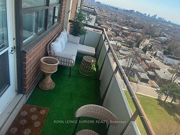 Large 1 Bedroom Condo, with great unblocked balcony views of the west end. Steps to the new Eglinton Crosstown station, Portuguese bakery, Bank, Grocery Store. Unit includes one parking spot. Coin Operated Laundry in common area. BBQ area, Tennis Court and outdoor Pool. Pets Restricted per Condo. Landlord will include 1 window AC unit.