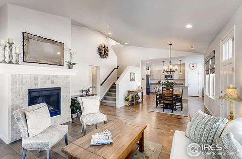 Premium location on community open space! This customized end unit has many upgrades: Cabinets, wood floors, lighting, doors. Thoughtful designer details abound in this townhome with its main floor master suite, great room with vaulted ceiling, fireplace, dining area, and lots of windows. The large kitchen has solid surface counters, lovely grey cabinets with soft close drawers, stainless appliances, a pantry and breakfast nook. Full laundry is on the main level. Upstairs has an office /study loft, two bedrooms, and a full bath. Lots of storage in the townhome. Walkable to Erie's Library, rec center, and Thomas Reservoir. Enjoy this vibrant community with gorgeous western views and a community garden.
