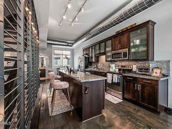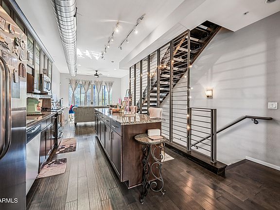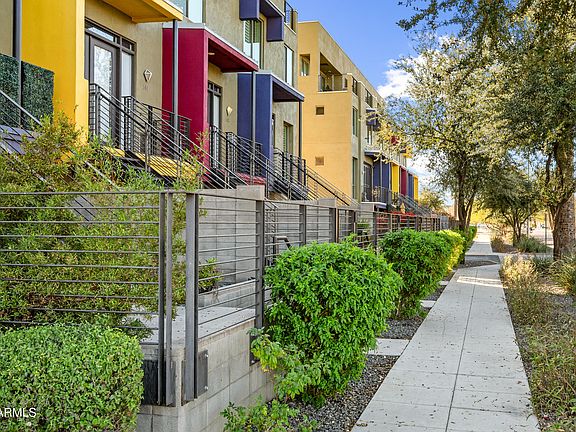 Very hip industrial-style townhouse in the heart of downtown...Walk to Roosevelt Row. Contemporary modern luxury feels almost 'loft-like' blending urban convenience, luxury and stunning views. 1623 square feet meticulously designed residence boasts 3 spacious bedrooms and 3.5 nicely appointed bathrooms. Stand-out features include exposed ductwork, real wood engineered hardwood flooring on main floor, sharp 15 foot granite kitchen island. Primary bedroom has large outdoor entertainment view-deck looking right up at stunning views of downtown skyscrapers. Your guests will envy being entertained here. Both A/C units have been replaced. Priced on the money! Private space in your own gated courtyard on ground floor. Easy to show, now vacant.