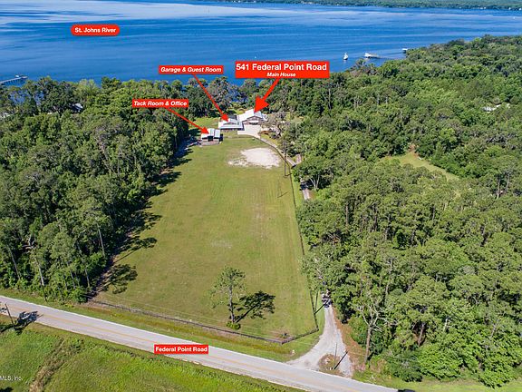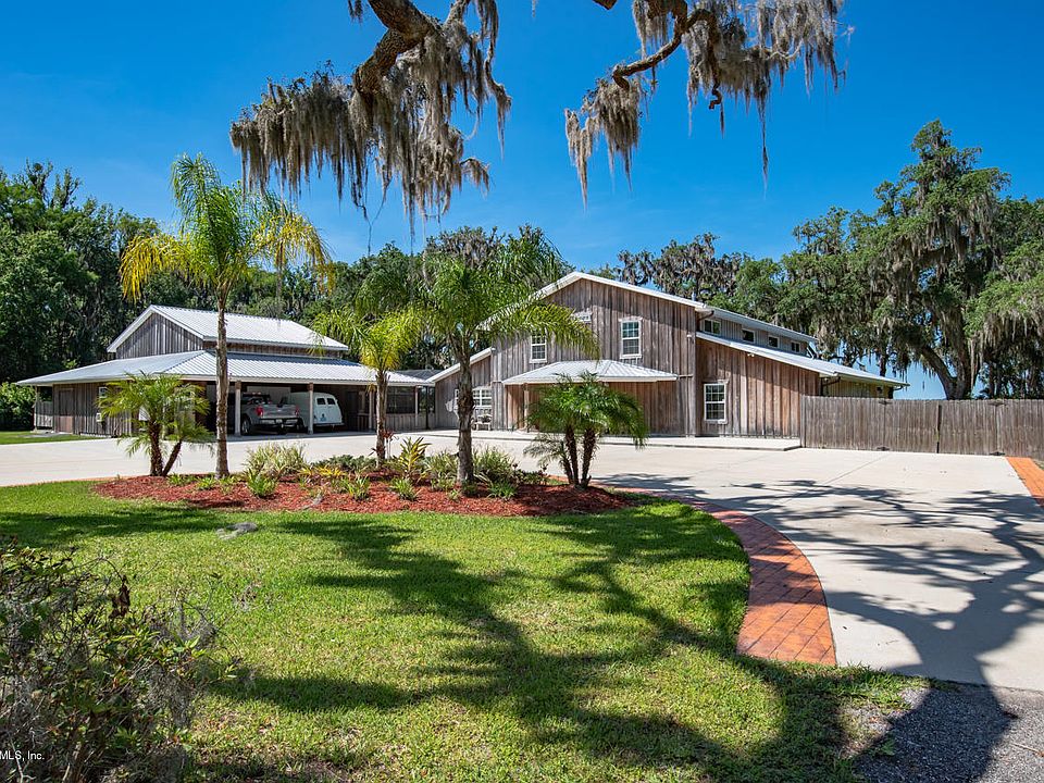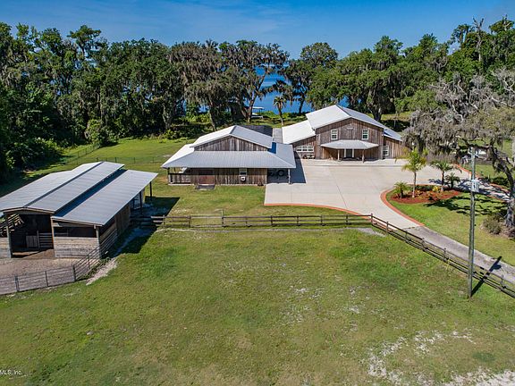 Incredible St Johns Riverfront Equestrian Estate! This amazing property offers the best of waterfront living with over 300 ft riverfront and 6.5+/- acres. Featuring 4200 sq ft of living space and almost 8000 sq ft under roof, plus a dock, a beautiful salt water pool and spa, and huge screened area; this is an ideal place for entertaining. Finished in a Rustic Industrial style, featuring gorgeous polished concrete floors, soaring wood ceilings, a beautiful metal and wood staircase; this home is truly one-of a-kind. Rooms include Great room with gas fireplace, a spacious kitchen with cooking island, two large living rooms overlooking the river, a private master retreat with luxurious bath, two guest rooms, and office. Also has a 2 car garage with guest suite, barn, pasture, and much more