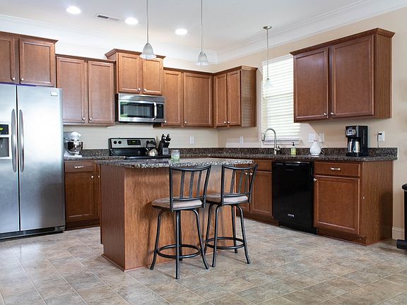 - Kitchen: Counter Tops-Granite, Eat In, Pantry, Island, Cabinets-Stained, Floors-Vinyl, Recessed Lights