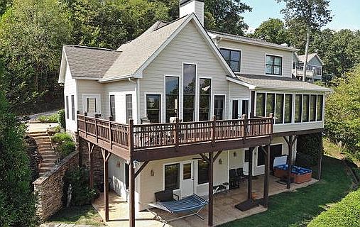 Fabulous, and Furnished, Craftsman Style home designed to take in the stunning long range views of beautiful Lake Chatuge and surrounding mountains from every room. Open floor plan is ideal for hosting parties and family gatherings. Home has an abundance of natural light from tons of windows and large Sunroom that can be accessed from the living room and Master B/R. Custom details & upgrades throughout include gorgeous T&G ceilings, wood & stone trim & accents, beautiful lighting and wood/tile flooring. Finished basement is a relaxing retreat complete with family room, stone F/P, spacious bed & bath, beautifully landscaped outside terrace with koi pond, stone waterfall and hot tub. Add'l features incl large 2 car garage & additional parking, security system plenty of storage and generator. Home has 3 B/R septic.
