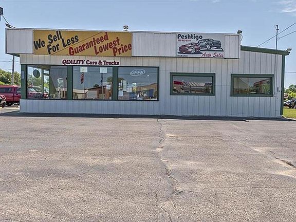 Peshtigo City commercial building with nearly 3,500 sq ft. Building is very well-maintained. Large open area with 14' to 16' ceilings, 10' overhead doors, and one hydraulic lift. Large bathroom, kitchen, walk-in cooler, and office space. Building has central air and a separate storage garage. It has been a successful auto dealership for 28 years, but it could be transformed into a variety of commercial uses.