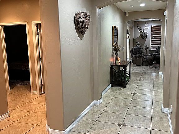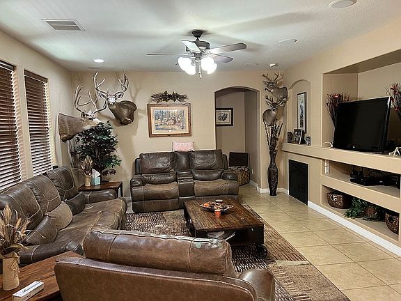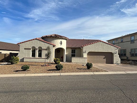 Split floor plan, three bedrooms on your left when you enter the home and the Master Bedroom is on the other end of the house. All the bedrooms have walk in closets. Open Living Room, Dining and Kitchen area. Granite counter tops, large island, pantry, custom cabinets, and stainless steel appliances. Home has a built in Fire Sprinkler System, plumbed for a Water Softener, gas fireplace, built in speakers in the living room and outside porch area, Hot Water Recirculating Pump, wired for a Security Alarm System, and is running off solar power for electric. Back yard has a great colored concrete patio that is covered. Also in the backyard is a small shop and a place for a hot tub. Nice family home with a great floor plan, great location, and one of the best views in Mountain Gate.