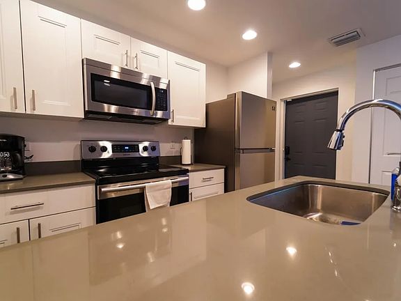 Quartz countertopsIn-unit washer and dryerSleek tile floorsContemporary kitchenStainless steel appliances