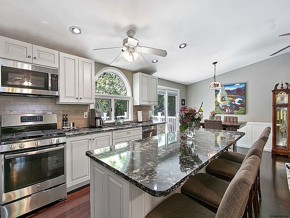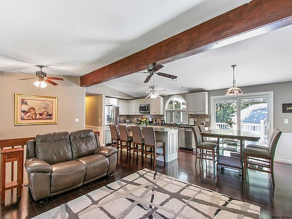 Nestled in a convenient location, this fairy tale ranch has been recently updated with all of the bells and whistles. New gourmet kitchen with stainless steel appliances, including a wine cooler, custom cabinets and quartz countertop is off set by stunning wood floors. Newer siding and roof as well! Two fireplaces keep the entire house warm and provide the perfect ambiance for snuggling in the cold weather months. Three beautiful acres, and located next to the Normanskill creek provide privacy just minutes from I90. Three season room, stunning deck and a patio with build in fire pit make the home and property a private paradise. Circular drive w/oversized detached garage that includes space for parking and a workshop! Municipal water hookup at the road, currently on shared artisinal well.