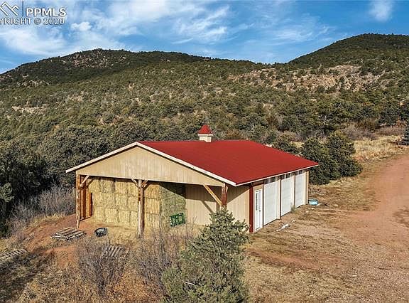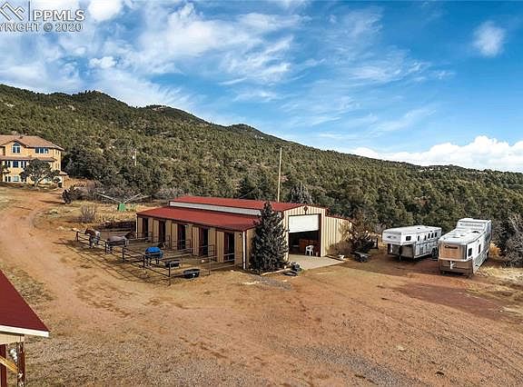Bring your Horses! This "Gated" 35 acres of forested oasis invites you home. Radiant heating warms the floors throughout. Incredible vaulted ceilings. You'll love the spacious floor plan, each window with its own breathtaking view. Check out the amazing kitchen with new stainless steel appliances. The Ownerâs Suite walks out to a private balcony with stunning views, private 5 pc master bath and walk in closet. Backyard is completely fenced and beautifully landscaped. You can build a 2nd home and the well water works great! Two car oversized attached garage and 3 car detached garage/shop (40x30) with hay storage. Six stall horse barn with drive through doors that can be used for RV storage with hook-ups (40x60), horse washing station w/hot water, heat, speakers, and heated tack room. Opportunities for boarding horses abound. Deeded access to hiking/horse trail behind property. 15 acres is fenced - the rest can be used for riding trails, hiking or family camping, 3 pastures separated by fencing. 2nd well is permitted, but needs to be re-drilled. Main well produces at 13-15 GPM - New pressure tank installed. Auto sprinkler in front and backyard enclosed by 6 ft wrought iron fence. Exterior has low maintenance stucco and tile roof. Tile roof serviced annually by Total Roofing - seller has extra matching tiles. Gas fireplace in Master Bedroom, wood burning fireplace in living room. Wine Cellar in basement. Multiple ceiling fans throughout. Skylights. Tons of Storage and Closet space. Plenty of room for your RV or Semi. Home is 15 miles south of Ft. Carson, 30 minutes from Downtown Colorado Springs. Near Cheyenne Mountain State Park.