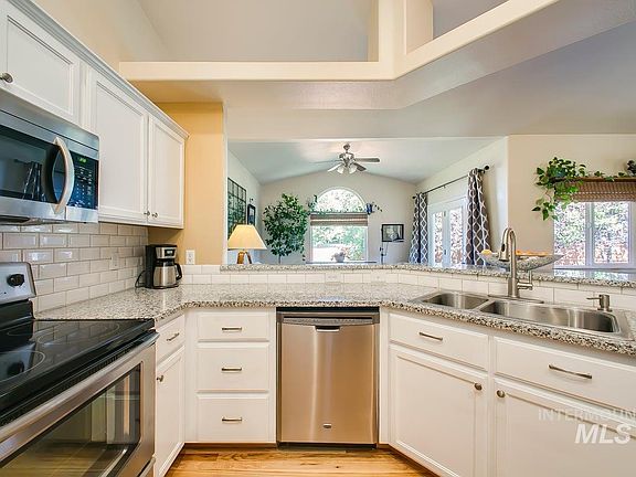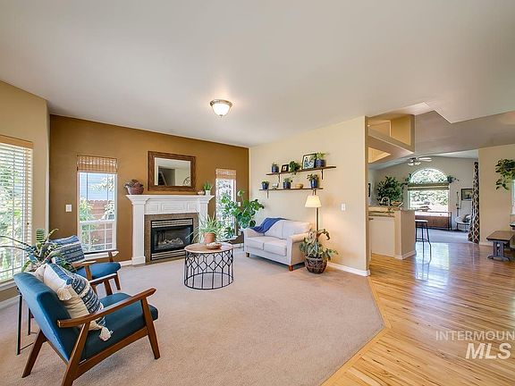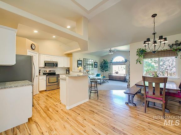 Beautifully maintained and exuding a welcoming character, this spacious residence is situated in a convenient South Boise location. A stunning interior defined by warm color tones and abundant natural light radiates throughout. Anchored by an elegant fireplace & soaring ceilings, the formal living room makes for the perfect space for entertaining guests. Beaming wood floors flow to a fresh, remodeled kitchen that treats the home chef to stainless steel appliances & crisp, modern finishes. Completing this stylish culinary space are gleaming granite countertops that extend to a breakfast bar that opens to the adjacent living & dining room. A main level primary suite offers convenience & privacy with an updated ensuite bath. Outside, elevated garden beds, lush fruit trees, and berry bushes shape the private backyard into a green thumb's delight. As a bonus, this ideal haven backs up to the neighborhood park, creating a serene outdoor setting.