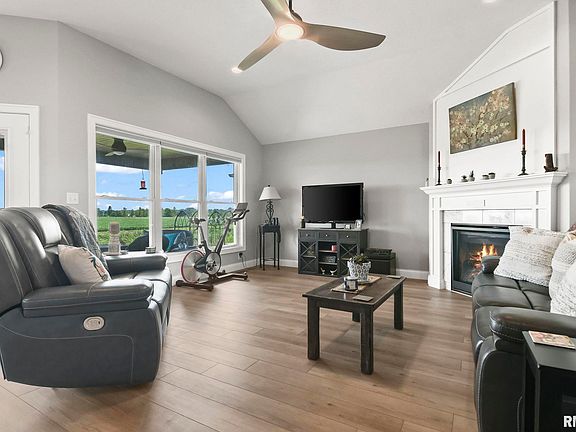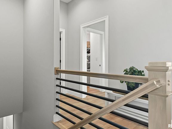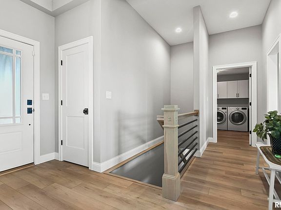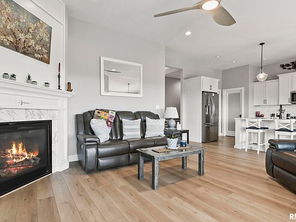 This stunning Brooklynn Homes ranch is designer-inspired featuring 2 beds, 2 baths & 2car att. garage. It sits on Springfield's West side in Centennial Pointe, a newer subdivision directly across from the beautiful Centennial Park and the well known Sangamon Valley Trail. The entry foyer welcomes with a tray/crown molding ceiling and a contemporary staircase leading to the lower level. Light-colored wide plank flooring stretches across the entire main level. The kitchen and both baths offer Quartz countertops and soft closing cabinetry Huge walk-in pantry & custom designed island and breakfast bar combination add to elegant kitchen features that include subway tile backsplash and high-end stainless appliances/convection oven. The master bath is equipped w/double vanity and a stunning glass-tiled shower. Master bath opens to a huge walk-in closet with direct access to a laundry/mud room and garage. The living room features a custom tailored fireplace and large south-facing windows allow ample natural light. The room opens onto a covered porch with beautiful views of the pond and park. Marx custom lighting and ceiling fans throughout and a full unfinished is plumbed for 3rd bath with egress window for 3rd bedroom. This home is built to energy star standards in a prime location in New Berlin Schools.