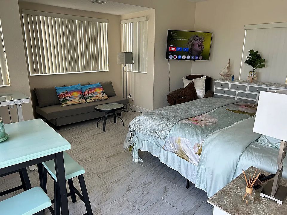 Prime large studio up stair apartment with private entranace 4 minute walk to St. Pete Beach across from Tradewinds Beach Resort available for short term 3-6 months lease. 500 Sq Ft with large 200 st ft deck with beautiful water view. Frigg, microwave, air fryer and washer and dryer. Internet, electric, water included in rent. Short walk to restaurants, shoppes and beach. 40 minutes to Tampa airport and 10-15 minute Uber to downtown St Pete.