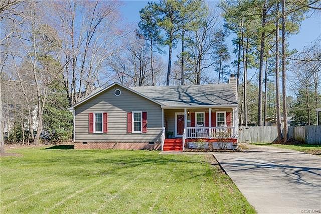 One Level Living at it's best! This Chesterfield County ranch home has all of the space you need at a great price and location. The quiet cul-de-sac street offers flat lots with plenty of breathing room. Current owner has worked hard to get this lush lawn to pop - front and back! A front porch is perfect for a few rockers to kick back and relax. Inside you will find an easy flow floor plan. The Living Room runs front to back with tons of space for entertaining. The fireplace provides a nice focal point and french doors offer light. The Kitchen has plenty of cabinet and counter space along with a pantry. The bay window is perfect for your dining table. A large master bedroom is complete with ample closet space and ensuite bath with shower. Two additional bedrooms share a full hall bath. The laundry closet is tucked nicely in the hallway. Fenced in back yard with patio. Detached storage sheds. Replacement windows. 1Yr HMS Warranty!