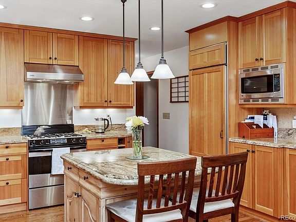 Located within the highly sought after Arapaho Hills historic neighborhood, this open, bright and welcoming home style boasts an abundance of natural light, vaulted ceilings and beautiful wood floors. At the heart of this home is the custom William Ohs designer kitchen featuring redwood cabinets, a large central island, slab granite counters, pendant lights, Thermador gas stove and Subzero refrigerator. The gas fireplace in the living room provides supplemental heat and is showcased by an exposed brick wall. The primary suite opens to a private balcony and includes a skylight with a remote controlled blind and a walk in closet. The primary bath is a William Ohs design and cabinets as well. There is a main level laundry room with a newer front load washer. The boiler system and water heater were replaced in 2021 for efficient heating and an evaporative cooler and attic fan keep the home comfortable in the summer. The roof, retractable awning and gutter helmets were replaced in 2018. Security doors are installed on both front and back. Double decks in the spacious backyard provide a perfect spot for your morning coffee or evening glass of wine. There is plenty of room in the oversized 2 car garage for a workshop which includes a workbench and built-in cabinets. Conveniently located near the South Platte River trails, old town Littleton, parks, light rail and award winning Littleton Public Schools.