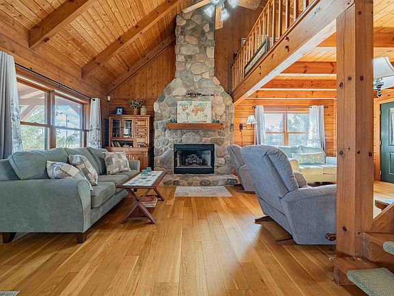 One of a kind, beautiful well maintained 3 level LOG HOME! Walk out lower level with bedroom, bath, family room, wet bar, gas fireplace & 1 car garage for mowers, tools, etc. Main level family room with gas fireplace, beamed ceilings, 20' eat in kitchen, Corian countertops, eat at bar, all appliances. Upper-level, bedroom, bath & loft. Beamed ceilings, Tiger and Bamboo wood floors, ceramic tile, whole house humidifier, dehumidifier, reverse osmosis, 40 yr roof warranty, 20x12 enclosed porch & multilevel decking overlooks pond (not part of property). Covered 32x8 front porch. Asphalt drive with turn around.