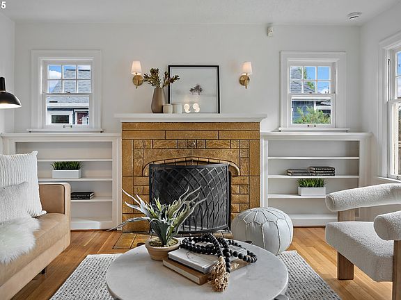 Welcome to this stunning storybook English-style abode tucked neatly between Woodstock & Mt Scott park's and just a stone's throw from convenient markets, eateries, cafes and food-carts of Woodstock & Foster. This home might be the perfect marriage between 30's era charm (original refinished hardwood floors, fireplace, ample bedrooms, graceful arches & vintage bathroom) and modern system updates including Hardiplank siding, roof, exterior & interior paint, light fixtures, idyllic picket fence & restored wood windows, hi-eff furnace, water heater & more! Inside, ample windows provide plenty of southeastern light - illuminating classic built-ins, formal dining room, charming kitchen & ample living room with fireplace. Have a sip of Oregon Pinot on the covered back patio while the gentle lapping of the water feature soothes you (rain or shine). The wooded fairytale yard provides a garden path, water feature, and shaded canopy amid a private sanctuary. For rest, two copiously sized main level bedrooms boast original (refinished) hardwood floors. Upstairs, the bonus loft area is ideal for a home office or workout space - and features plenty of storage. The primary bedroom offers hardwood floors as well and is nicely tucked away from life's hustle-bustle. Bring your vision to the lower level. Not only does it offer high ceilings and side entrance from the breezeway (future ADU anyone?) - it has ample space for a family room, workshop and more. Don't miss the detached, over-sized garage perfect for restoring a car or storing all of your gear. All of this just minutes to downtown PDX, airport, Clackamas Town Center & more! Walk Score of 78! Bike Score of 99! What are you waiting for? [Home Energy Score = 2. HES Report at https://rpt.greenbuildingregistry.com/hes/OR10241776]