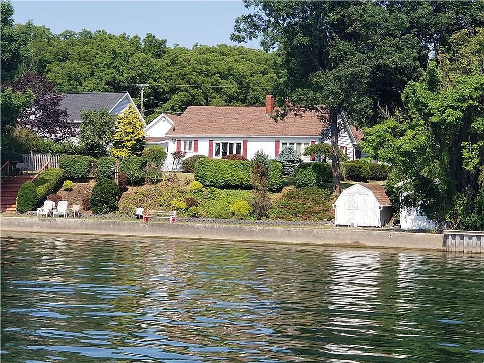 ***SENECA LAKEFRONT HOME ON 123 FT OF FRONTAGE*** This 1900 sf Ranch style home offers 4 Bedrooms and 2 full Bathrooms. You'll enter the home through the enclosed Porch. The features of the home include the Kitchen with adjoining Dining area. The Living Room offers Lake views and a Wood Burning Fireplace. There are 4 bedrooms and 2 full Bathrooms. The home has a full Basement and a One Car attached Garage. The Lakefront has a Concrete Breakwall and two storage buildings. The permanent Dock has two covered Hoists. Amazing Sunsets over Seneca Lake!