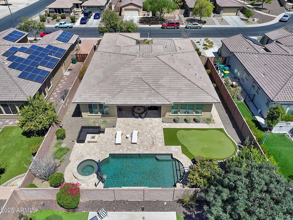 Welcome to this exceptional cul-de-sac single-level ranch in Jackrabbit Estates, offering over 3,000 sq ft of thoughtfully designed living space. Featuring 4 bedrooms, 3.5 bathrooms, a dedicated office, and a 3-car garage, this home combines comfort and function. The open floor plan is ideal for entertaining, with seamless indoor-outdoor flow to the covered patio, sparkling heated pool and putting green. Enjoy premium upgrades throughout including plantation shutters,2 new AC units, outdoor gas fire pit and citrus trees.