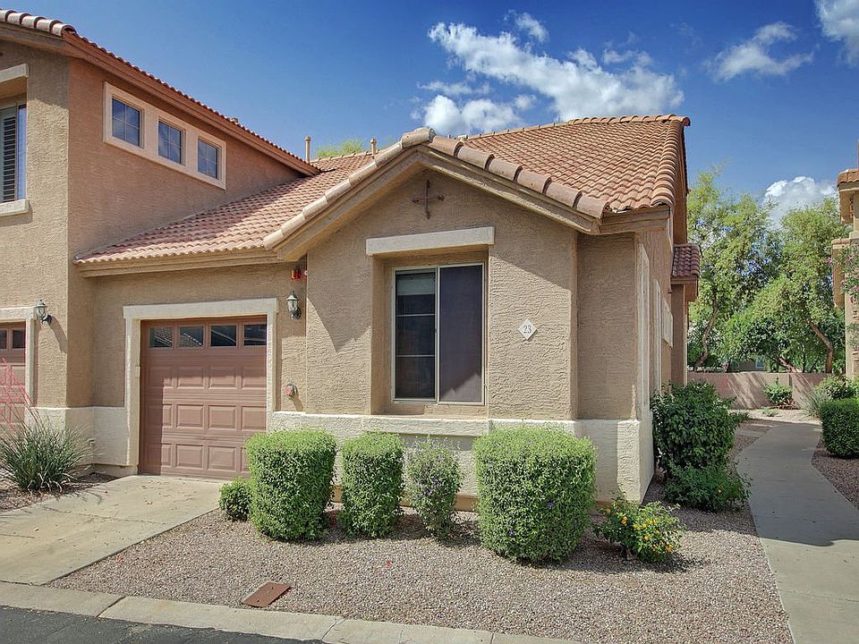 Bright and open, end unit townhome with vaulted ceilings in the desirable gated Golf Course community of Desert Springs at Alta Mesa. Split floorplan with TWO Master suites, one downstairs and one upstairs with large walk-in closet. Your own 1 car garage, and a large, private back yard with lush greenery, covered patio and private 4-person hot tub. The kitchen provides tons of storage, a breakfast bar and spacious pantry. The downstairs Master suite offers tall ceiling and two separate closets. Large laundry room with built in cabinets and a large storage/linen closet. Custom sunscreens and blinds, custom security doors. Community green belts and sparkling pool, all close to dinning, shopping and quick access to the Loop 202.
