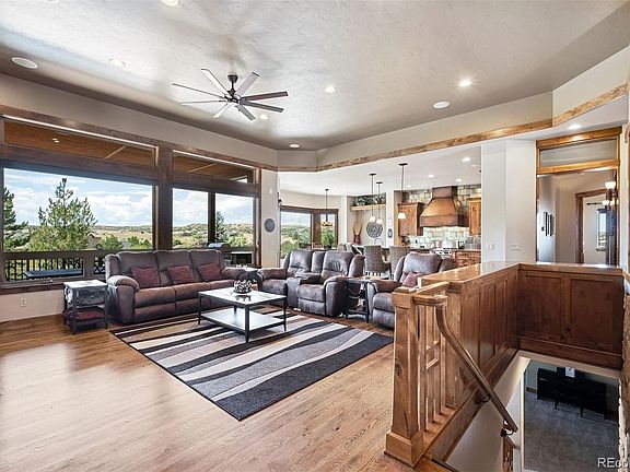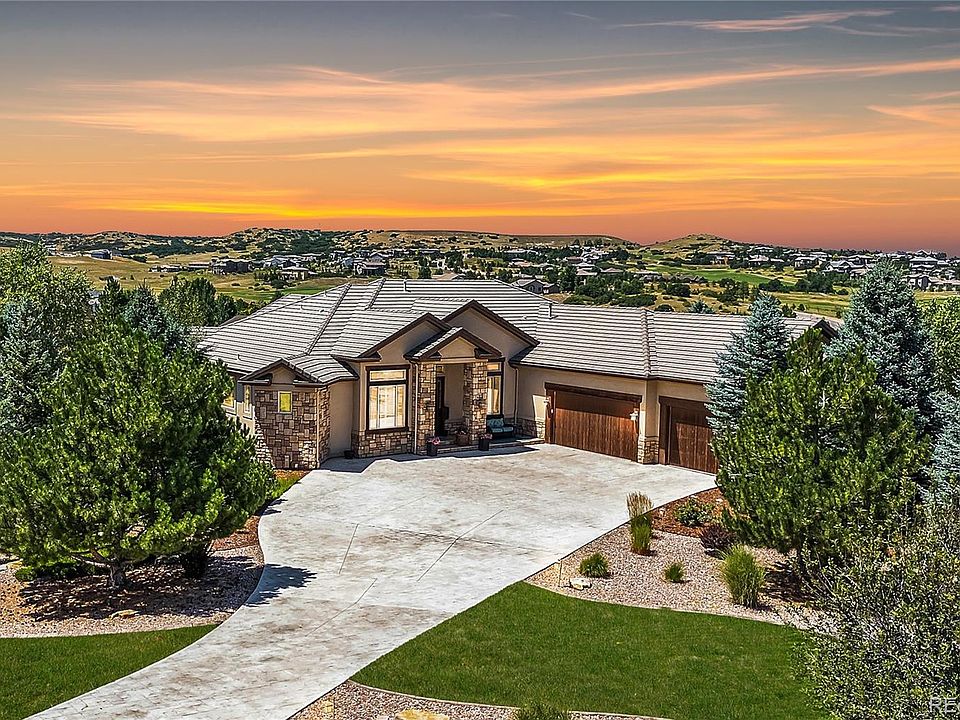 Incredible, luxurious ranch-style home in Pradera, presenting a custom backyard oasis and stunning panoramic views inside and out. Situated on a premium lot at the end of a tranquil cul-de-sac, this 5-bedroom, 7-bathroom residence exudes elegance and warmth. The main floor features a great room with expansive windows, a fireplace, and breathtaking views. The gourmet kitchen is equipped with high-end designer appliances by Wolf and Sub-Zero, a huge island, a large pantry, and an eating area with doors to an expansive Trex deck. The primary suite offers a fireplace, sitting area, doors to deck, and a luxurious 5-piece bathroom. Additional main floor highlights include a formal office with built-ins, a formal dining room, two bedrooms, a full bathroom, and a laundry room with a dog wash. The interior is adorned with solid alder doors, custom trim, woodwork, blinds, window treatments, built-ins, hardwood floors, and a whole home and yard Savant sound system. The recently remodeled lower level offers endless living and entertainment possibilities with a recreation room featuring a full bar with a beverage fridge and icemaker, a billiards room with a closet and powder bathroom, a home theater with custom sound panels, a world-class gym with equipment included, a bathroom with a sauna and steam shower, and two ensuite bedrooms. The custom backyard retreat includes a covered stamped concrete patio, a heated saltwater swimming pool with a waterfall, a hot spa with a waterfall, an outdoor fireplace, a professional sports court, and beautiful landscaping. The property backs to open space and is close to the 11th fairway of the private Club at Pradera Golf Course and Country Club, providing a serene setting perfect for entertaining and enjoying Colorado sunsets. Additionally, the home has an oversized 3-car garage with storage cabinets and epoxy floors. This exquisite abode is designed for those who appreciate luxury living and enjoy entertaining family and friends!