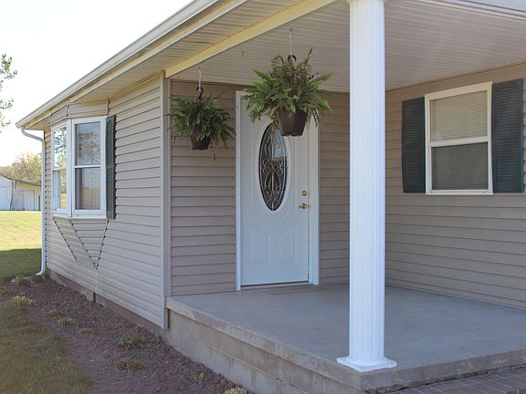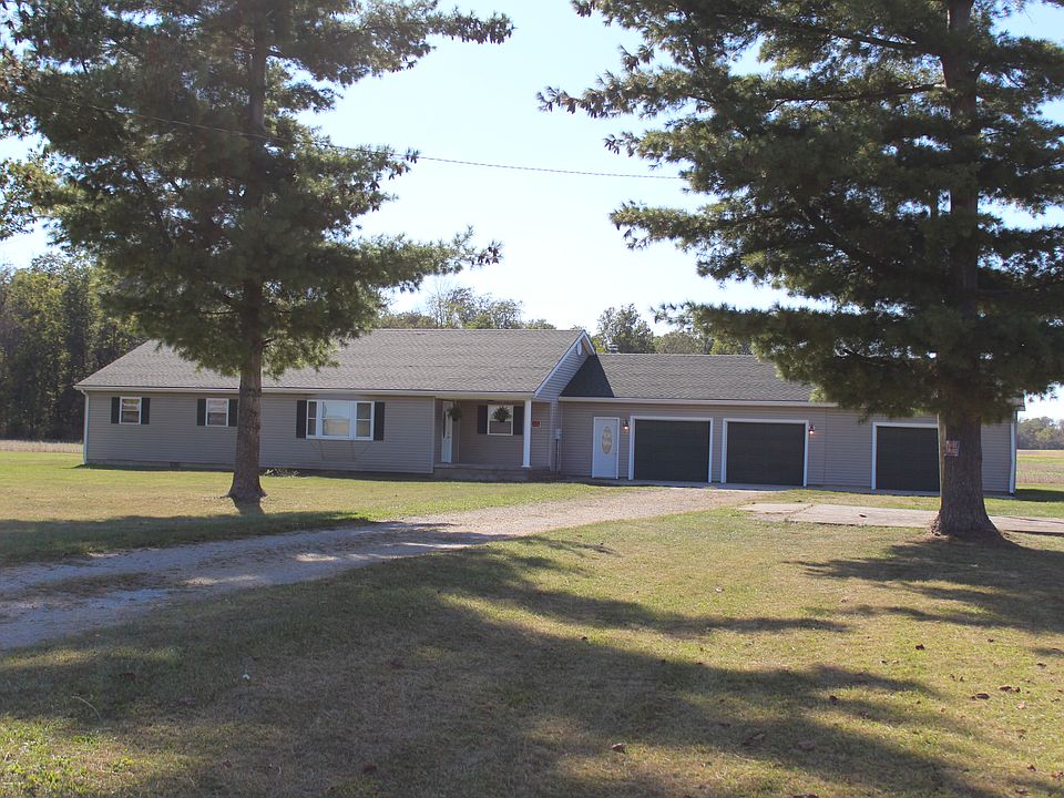 4 bedroom, 2 full bath, large living room, kitchen and utility room. 2052 square feet living area and 1300 square feet garage with a three garage doors attached to the home. Also, 2 barns with horse stalls on the property of 4.4 acres. Liberty Perry School System. Surrounded by farm ground and woods.