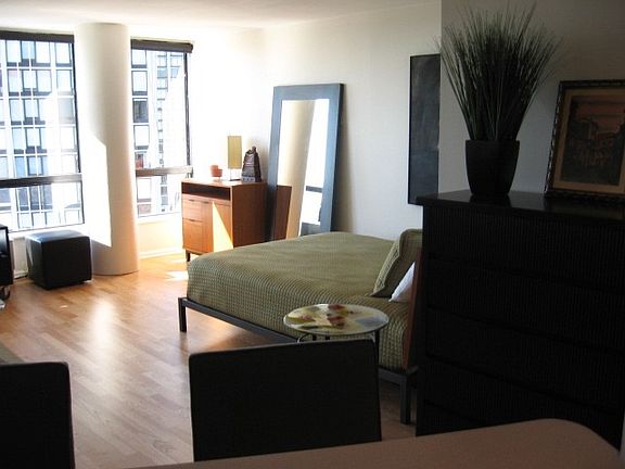 TURNKEY beautifully FURNISHED amazing studio with lake and city views! Tons of closet space with additional storage cage on another floor. Everything you need is included so move in with your suitcase. ALL UTILITIES INCLUDED except electric. Wi-Fi, cable TV w DVR, central A/C and Heat. Hardwood floors and floor to ceiling windows. Lake and north city views. Gym and pools avail at slight additional charge. One year min lease with fee's. Indoor parking $125. per month. Sorry ..no pets., no smoking. Call for a showing. Available July 1st. Express bus in front of building, Redline nearby, Park outside back door, BEAUTIFUL BEACHES, grocery stores, restaurants, gyms all nearby. All utilities included except electric. $300 move in fee.
