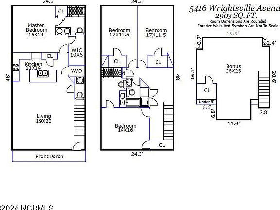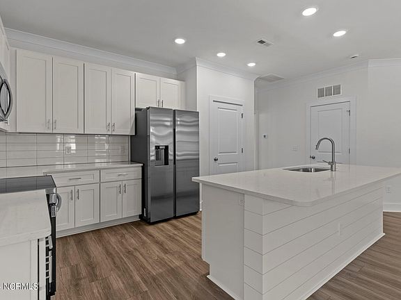 Gorgeous new construction 3-story home conveniently located on .22 acres near UNCW and Wrightsville Beach. Spanning 2,903 square feet, this home encompasses 4 bedrooms, 3.5 bathrooms, plus a large bonus room. Upon entering, you'll be greeted by an inviting open floor plan, ideal for comfortable living, with luxury vinyl plank flooring throughout the main living areas. The well-equipped kitchen features elegant quartz countertops complemented by a sleek subway tile backsplash, a shiplapped island with a large single basin sink, solid wood cabinets with soft-close cabinetry and drawers, stainless steel appliances including a refrigerator, and a pantry. The side patio off the kitchen is perfect for grilling and entertaining. The first-floor master suite features a large walk-in closet, and an en suite bathroom with a walk-in tiled shower, dual vanities, and linen closet. Upstairs, you'll find three bedrooms, two full bathrooms, and a spacious loft area that can be used as a home office or flex space. The front bedroom offers its own en suite bathroom with dual vanities, and a spacious walk-in closet, perfect as a primary guest suite. The third floor is a sizable 26'x23' bonus room with a large walk-in closet, making the perfect entertaining space, playroom, or additional bedroom. Stackable washer and dryer hookups are on the main level and an additional laundry closet sits on the second floor, so you have the option to use both for easy living. This prime location is within walking distance to grocery stores, coffee shops, numerous dining and entertaining options, and only 4 miles to Wrightsville Beach. Call today to make this beautiful new construction home yours!