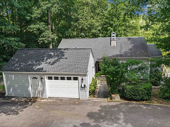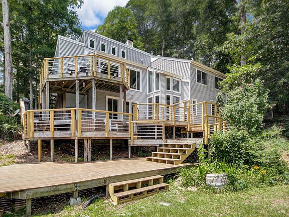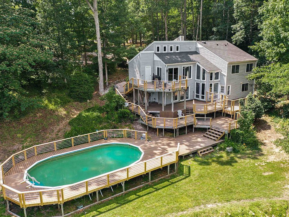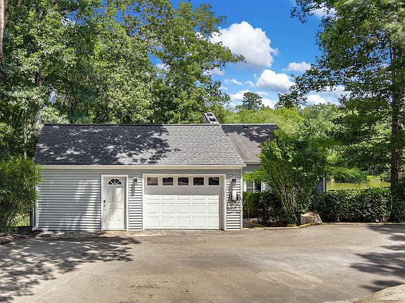 Once you walk into this house and see the backyard you will feel like you were transported to your own private oasis. The five-tier Trex deck overlooks the beautiful landscape. You can enjoy swimming in the pool, fishing in the private pond, or kayaking down the Falls of the Neuse River that runs through the back of the property. If you prefer to stay dry the brick firepit is the place to be. Inside this home, you will find a light and bright kitchen with skylights, new cabinets, gas cooktop, & large island. The family room features vaulted ceilings with striking beams and a beautiful stone fireplace. The main floor also boasts a spacious office and secondary bedroom. On the lower level, the primary bedroom has a fireplace and direct access to the deck so you can easily enjoy the backyard. The expansive bonus room with a fireplace is a great place to enjoy spending time inside with family and friends. There is also a permanent electric car wall charger. This peaceful and private paradise is the perfect place to call home.