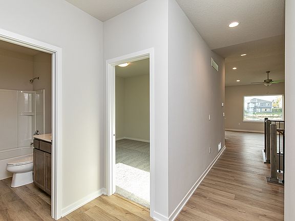 The Chariton plan has three bedrooms, two bathrooms, and a two-car garage. On the main level, this plan features a large family room that opens into the dining and kitchen space. Also on the main level is the master suite, laundry, two bedrooms, and a bathroom. The optional lower level of finish has a large living room, additional bedroom, bathroom, and plenty of storage.