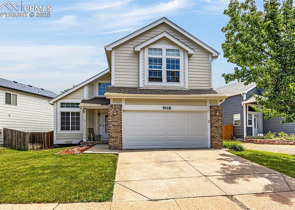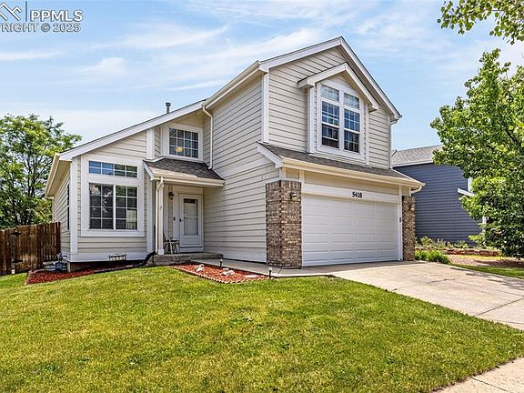 Welcome to this wonderful two-story home in the desirable Stetson Hills neighborhood featuring 3 bedrooms and 3.5 bathrooms. A short walk to Pring Ranch Park and easy access to multiple shops, stores and restaurants in the surrounding area. Located just minutes from Powers Blvd your commute anywhere in Colorado Springs is incredibly convenient. As you enter, you're introduced to your open living room with high vaulted ceilings, gas fireplace and overhead accent shelving. Luxury vinyl plank floors run throughout your living room and through your attached dining room combo. Walk out to your backyard is also accessible from your living room. Your kitchen offers ample cabinets and storage, an eating/drinking nook, loads of counter space, granite countertops, and all kitchen appliances stay with the home. A 1/2 bath is located conveniently next to the 2-car garage. Upstairs you'll find your large primary bedroom with vaulted ceilings featuring a walk-in closet and an adjoined 4-piece bathroom with double vanity and large soaker tub/shower. 2 additional bedrooms are located upstairs, along with a full bathroom and laundry space. The basement features 500 finished sq ft used as a recreation room or as a non-conforming 4th bedroom; another full bathroom and extra storage provided as well. Your stunning backyard offers a well maintained yard with lush grass and an expansive stamped concrete patio. Your new home also includes air conditioning, an in-ground automatic sprinkler system, 2 car garage, and open concept floorplan. 5418 Blackcloud Loop is the perfect location next to schools, parks, access to multiple military bases, shops and all the amenities you could need! Don't wait, come see this stunning home today!