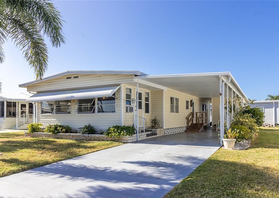 Bring your toothbrush and clothes to this beautifully TURN KEY furnished home. NO LOT RENT HERE you own the land. Nestled within Chateau Village, a well-established 55+ community, this property offers a comfortable and convenient living environment. The home features two bedrooms and two bathrooms, providing ample space for residents. Both bathrooms are equipped with walk-in showers, adding convenience to daily routines. A notable feature of this home is the Florida room, which has its own A/C unit, making it an ideal space for relaxation and leisure. Additionally, the open floor plan allows for a bright and inviting atmosphere throughout the home. In the kitchen, there's a breakfast bar, offering a casual dining space that's perfect for quick meals or socializing. The property also includes a utility shed with a washer and dryer for added convenience. For outdoor access, there is a back gate, providing a convenient way to enter or exit the property without needing to access 53rd Ave. Moreover, residents can take advantage of the various amenities within the community, including access to Shuffleboard and the Community Pool. An attractive aspect of this property is the absence of lot rent, which can be a financial benefit. The property is complemented by a low monthly maintenance fee of $210, which covers essential services such as water, sewer, trash, lawn maintenance, Internet, Cable, and property management. Its strategic location near shopping centers, banks, restaurants, and the airport adds to its appeal, making it an excellent choice for those seeking an affordable and hassle-free living experience in a vibrant 55+ community.