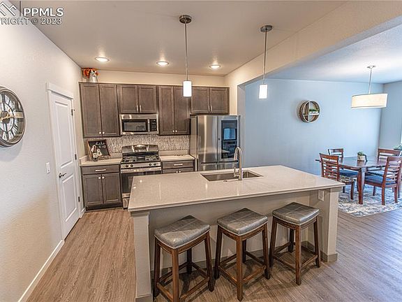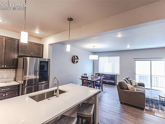 Well maintained townhome with loads of builder upgrades. Quartz countertops throughout, brushed nickel modern fixtures and under-counter mount farmhouse sink in the island with disposal and dishwasher. Gas range with built in microwave above. Upgraded 42" upper cabinets, almost to the 9' ceilings! Walk in pantry. Balcony off living room. Main level has LED puck flush mount ceiling lighting, as well as pendants in the kitchen and a modern light fixture in the dining room. Luxury vinyl plank flooring throughout the main level. Large picture window at stairs flood the home with light. Upstairs loft has LED puck ceiling light fixtures. Master bedroom has flush mount ceiling light fixtures on dimmer, ceiling fan, giant walk in closet. Adjoining master bath has modern walk in glass door shower with tiled walls and bench. Double vanity with quartz countertop and beautiful dark charcoal tile floor. W/D closet on upper level. Shared upper bath has tiled bath wall and convenient linen closet. 2nd bedroom also has a walk in closet. Home has a whole house humidifier & AC. 2 car garage is fully insulated & dry-walled. The garage door is also insulated. Move in ready! Seller will repaint 2nd bedroom mural wall to match the rest of the walls if buyer requests.